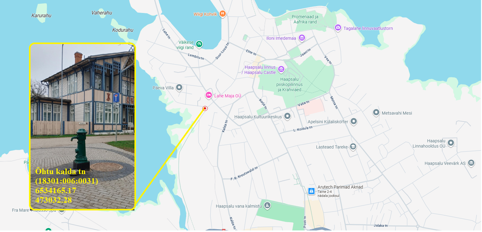 Haapsalu linna avalik veevõtupüstak Haapsalu linnas on avatud veevõtupüstak Õhtu kalda tänaval (18301:006:0031) koordinaadid: X:6534165.17 Y:473032.28
